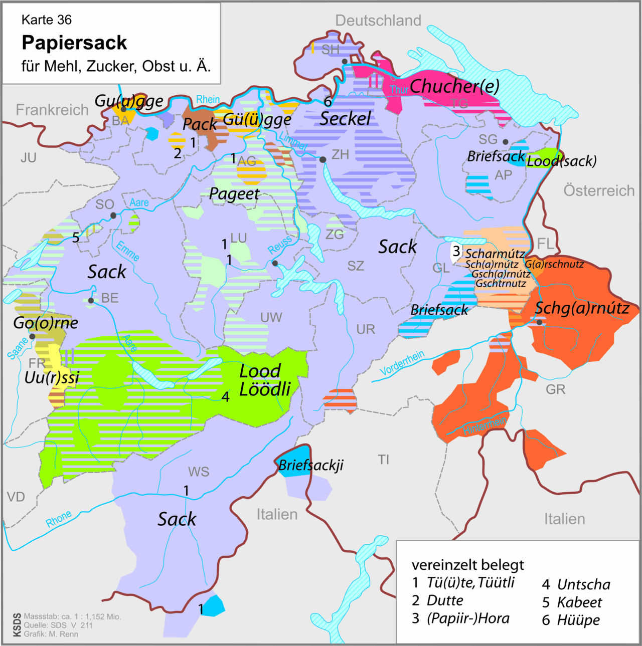 Mit dem Aufkommen fabrikmässig hergestellter Säcke änderte sich der Sprachgebrauch. Der einfache Sack setzte sich durch und wurde zur meistverwendeten Bezeichnung für Verpackungen aus Papier. Dennoch zeigen alte Zusammensetzungen wie Loodsack oder Papiirpack, dass man die handwerklich gefertigten Verpackungen nicht so rasch vergessen hat. Diese Vielfalt an Begriffen ist ein sprachliches Zeugnis der Alltagskultur, die eng mit der Geschichte des Handels, der regionalen Eigenheiten und der Mehrsprachigkeit der Schweiz verbunden ist.