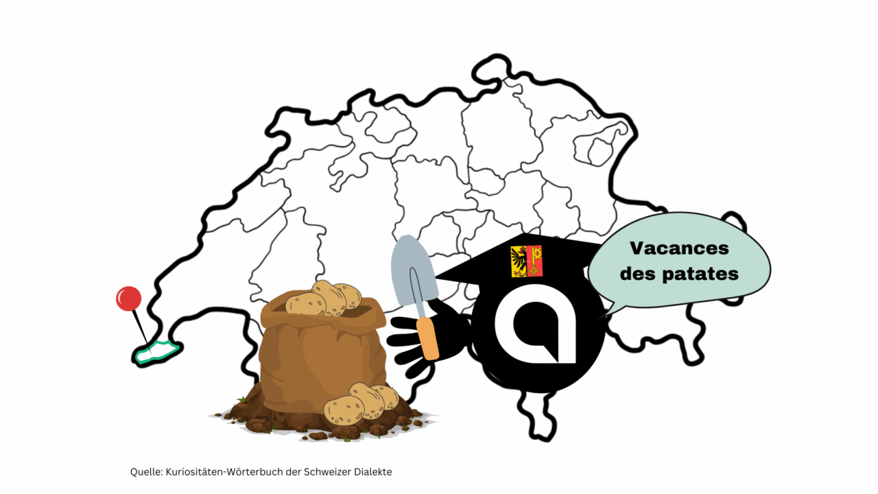 Il n’y a pas tous les cantons suisses qui utilisent les mots «vacances de patates» ou «vacances de pommes de terre«. Le canton de Genève a une forte tradition de l’expression «vacances de patates«. Le terme «vacances de vendange» 🍇🍷 est également utilisé dans certaines régions du canton de Vaud.