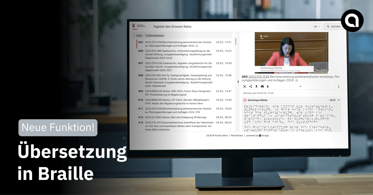In diesem Modus wird das Protokoll automatisch in Brailleschrift dargestellt – ideal für Nutzer:innen, die Inhalte auf unterschiedliche Weise wahrnehmen möchten. So lassen sich Sitzungsprotokolle noch inklusiver und barrierefreier nutzen.